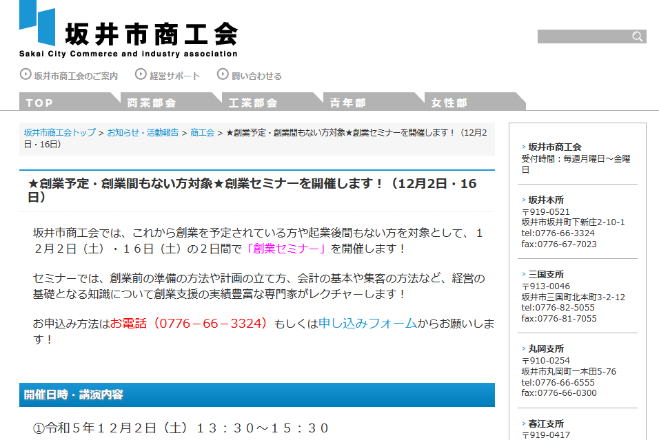 2023年12月2日(土)、16日(土)、坂井市商工会にて開催されます「創業セミナー」に、佐藤が講師を担当します。